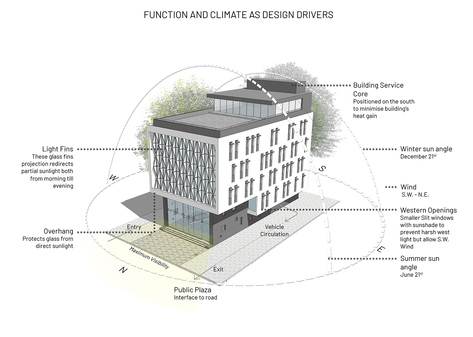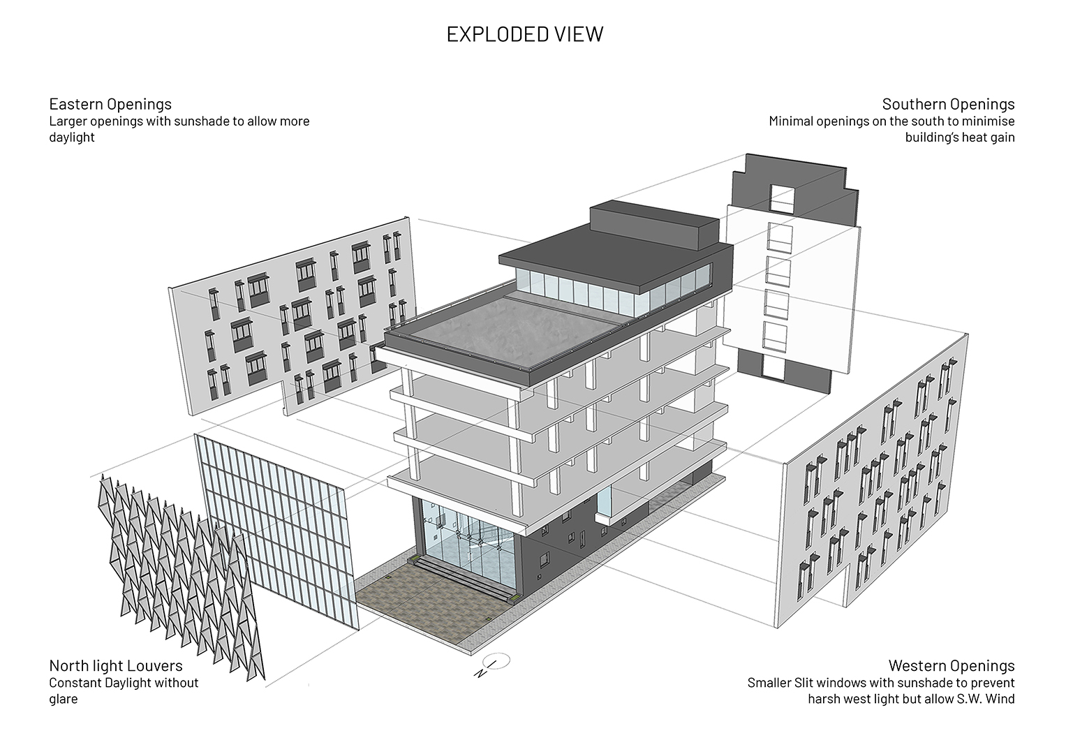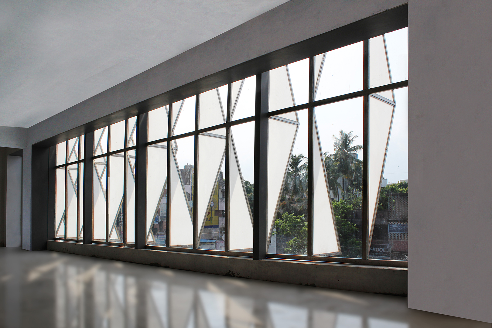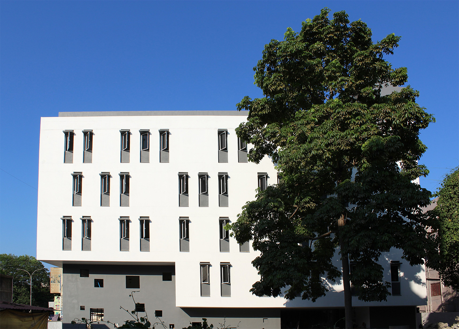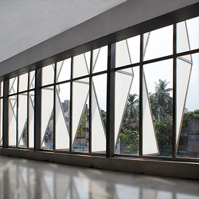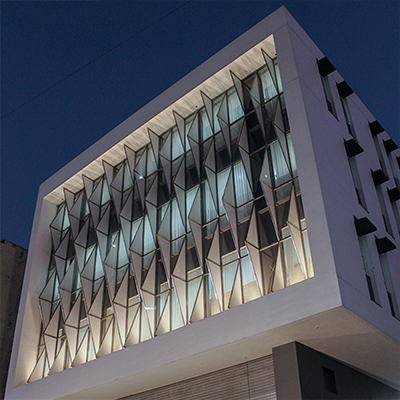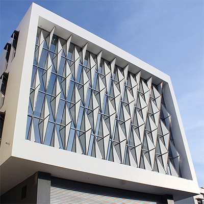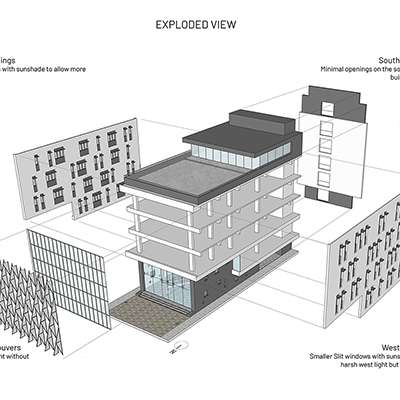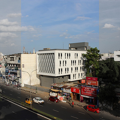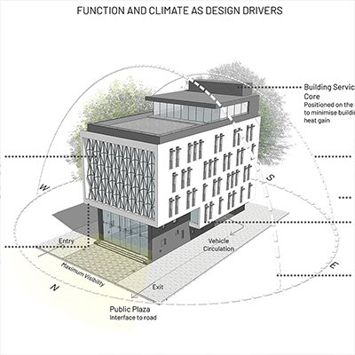 The idea was to create a climate responsive building which maximizes the visibility of the building and tap the footfall, as the site is located between the existing railway station and an upcoming metro station. The north side faces the street and the double height retail facade is protected by cantilevered office floors. The triangulated translucent poly-carbonate fins’ pattern cut the direct sun-light while acting as an innovative shading-device, thereby, providing effective day-lighting and also reducing the solar heat-gain on the building. The building has an iconic presence on the road due to its aesthetic essence and it consumes 15 percent less energy due to the climate-sensitive design features which reduces the life-cycle cost of the building.
