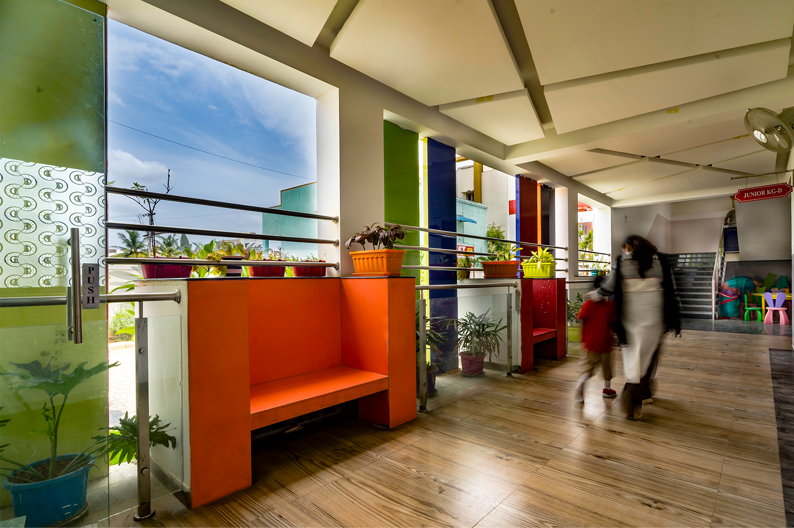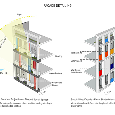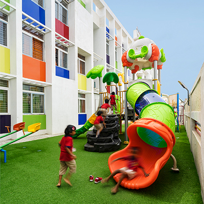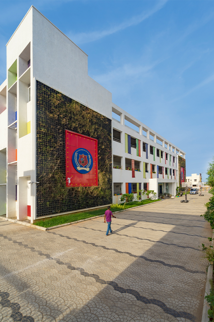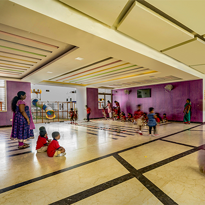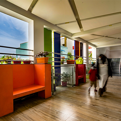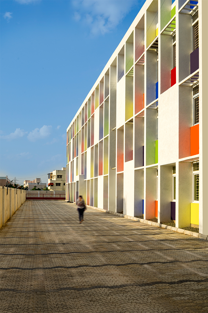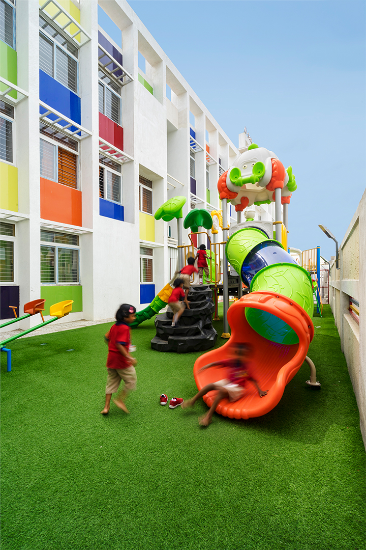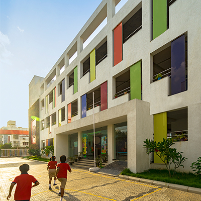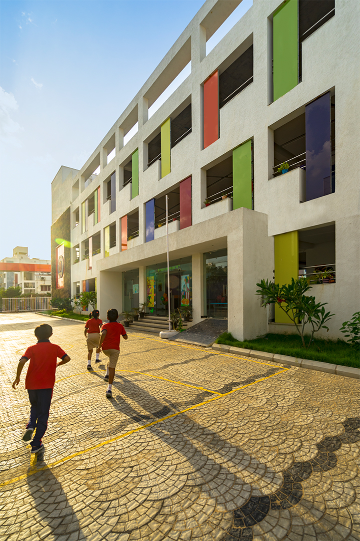 The aim was to develop a healthy learning environment for children with green concepts in a constrained site that is cost effective. The west wing of the ‘L’ shaped building with classrooms are light through large windows on either side and shade cuts direct sunlight limiting the glare. Along with light pockets in the corridor with social shaded spaces the interspacing within the circulation also supports cross ventilation while promoting interaction. The south wing contains the common and supporting amenities. The facades are interlaced with colored panels which brings a play of colors inducing an identity while functionally holding the storage areas. The main entry façade and play areas add to the feel of spaciousness in this vertical development.