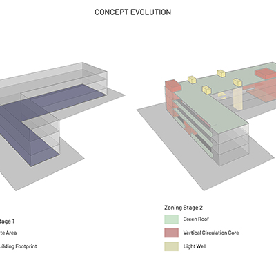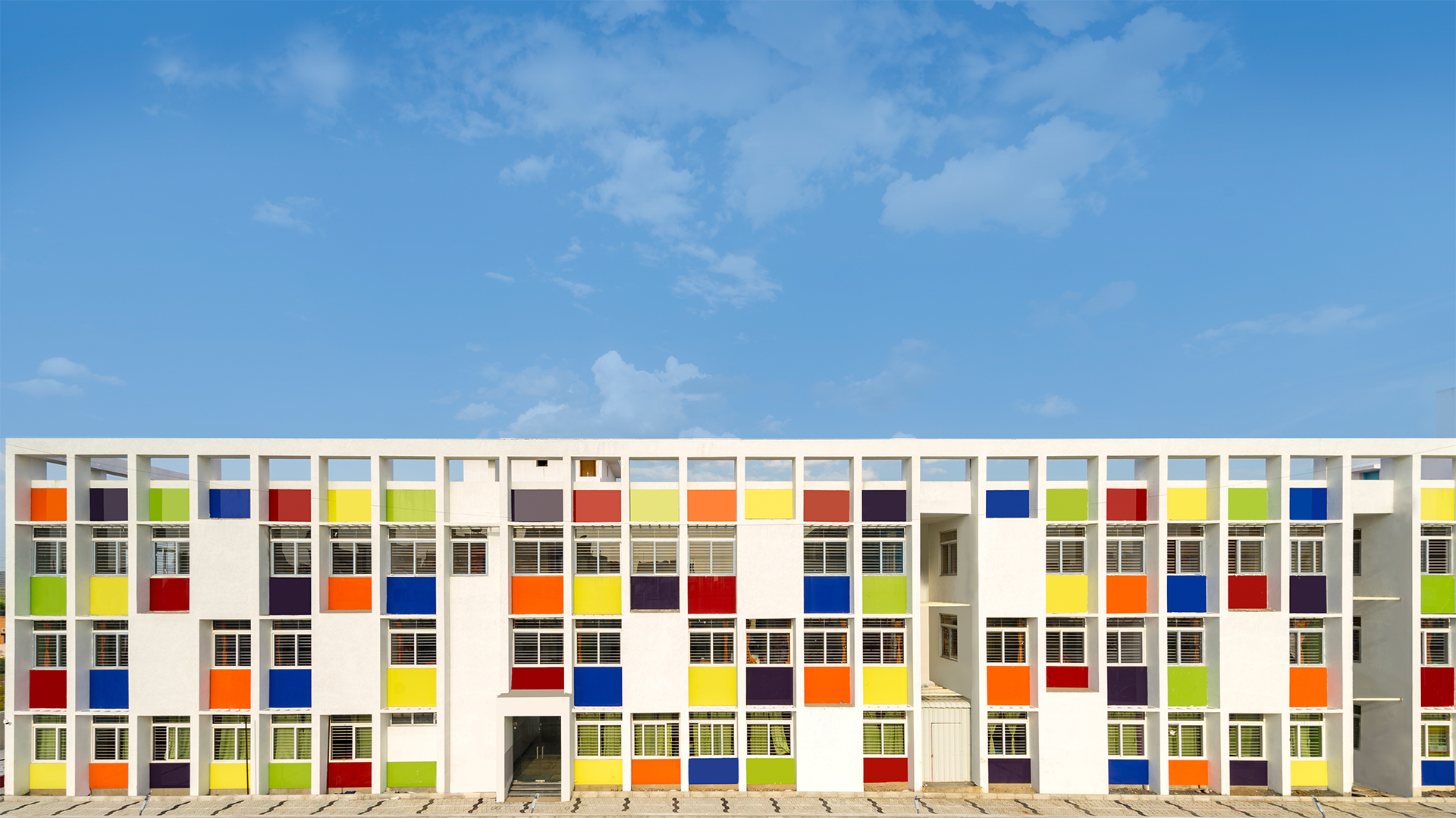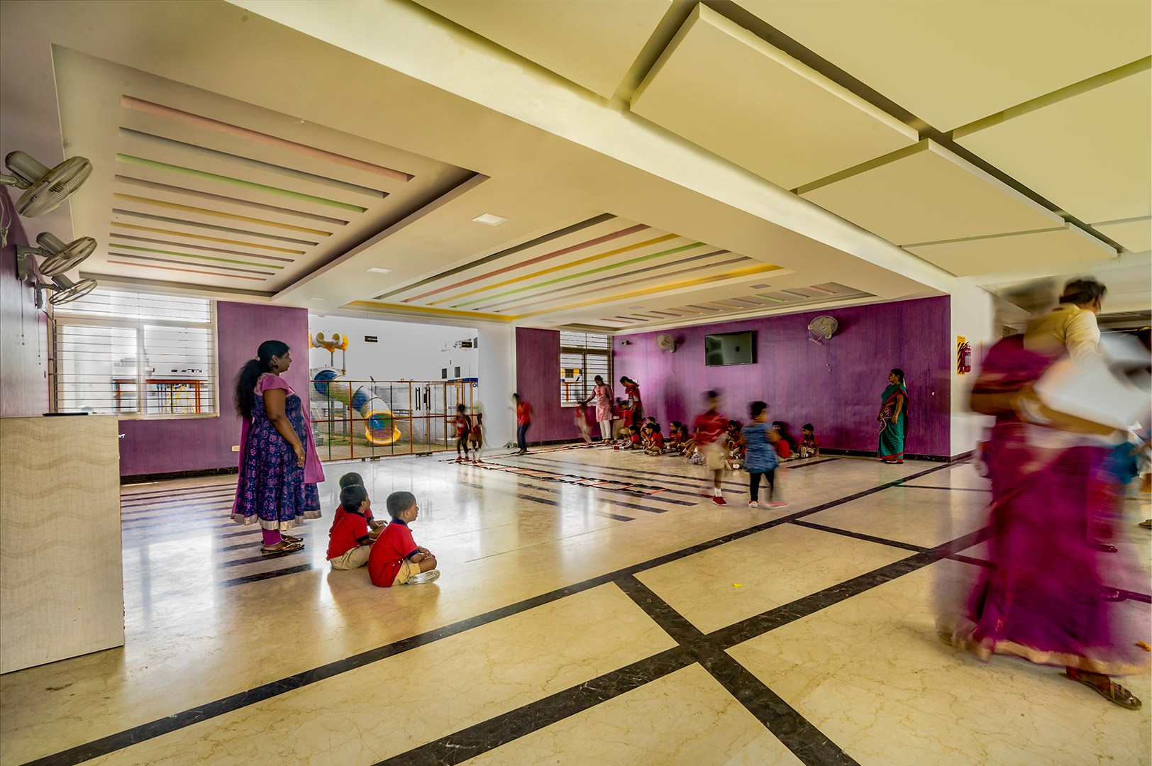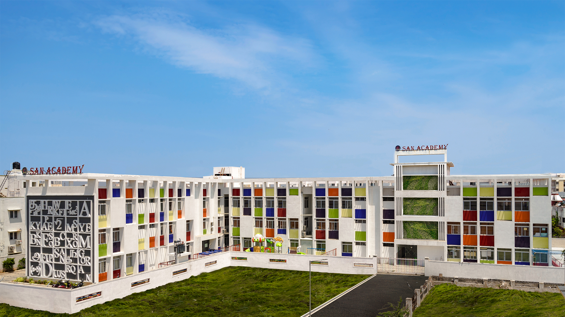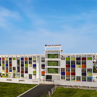 The aim was to develop a healthy learning environment for children with green concepts in a constrained site that is cost effective. The west wing of the ‘L’ shaped building with classrooms are light through large windows on either side and shade cuts direct sunlight limiting the glare. Along with light pockets in the corridor with social shaded spaces the interspacing within the circulation also supports cross ventilation while promoting interaction. The south wing contains the common and supporting amenities. The facades are interlaced with colored panels which brings a play of colors inducing an identity while functionally holding the storage areas. The main entry façade and play areas add to the feel of spaciousness in this vertical development.