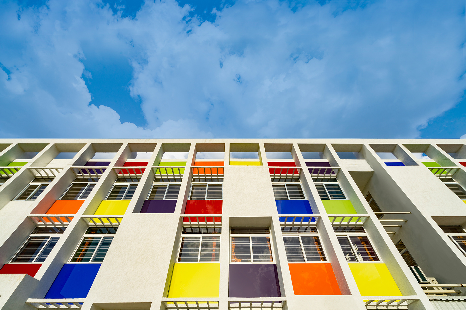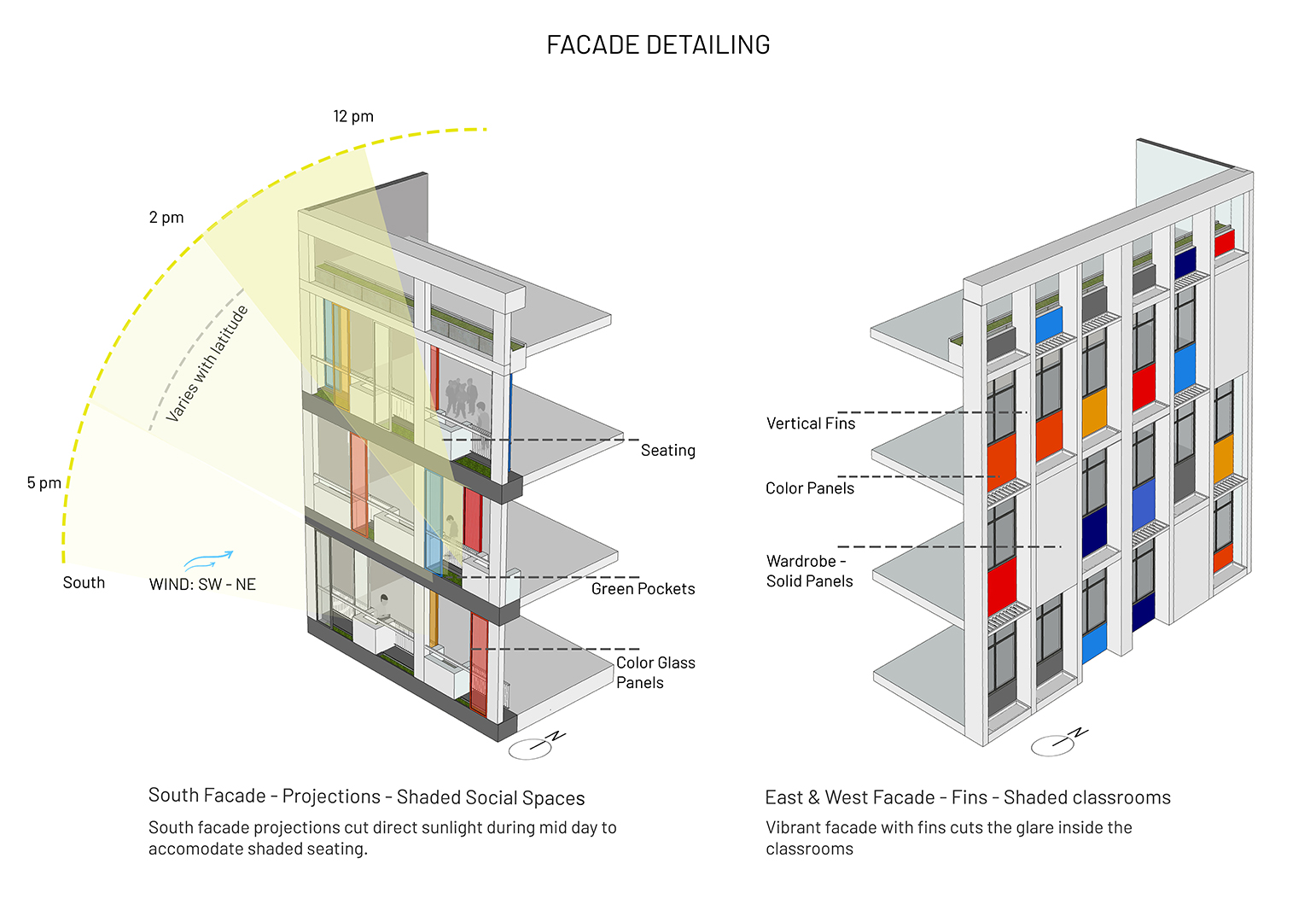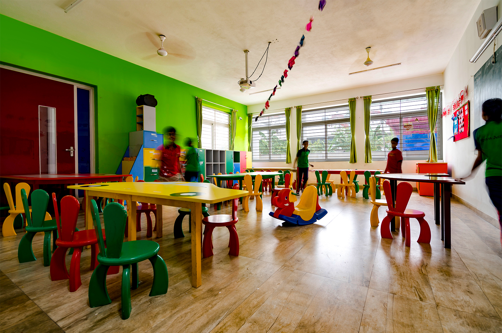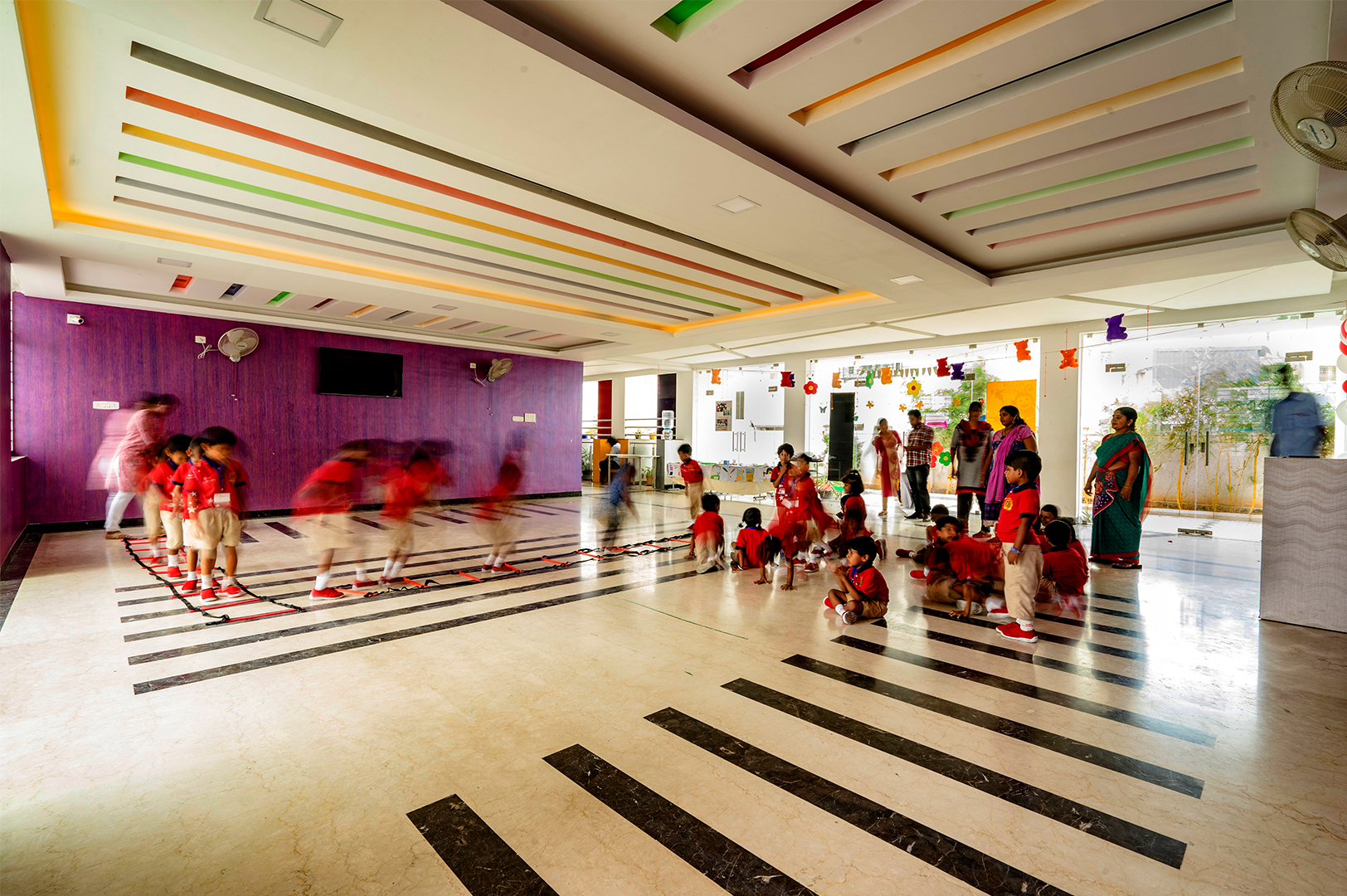The aim was to develop a healthy learning environment for children with green concepts in a constrained site that is cost effective. The west wing of the ‘L’ shaped building with classrooms are light through large windows on either side and shade cuts direct sunlight limiting the glare. Along with light pockets in the corridor with social shaded spaces the interspacing within the circulation also supports cross ventilation while promoting interaction. The south wing contains the common and supporting amenities. The facades are interlaced with colored panels which brings a play of colors inducing an identity while functionally holding the storage areas. The main entry façade and play areas add to the feel of spaciousness in this vertical development.